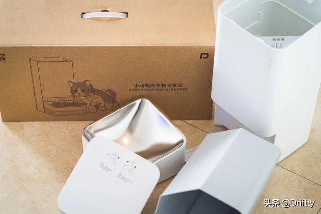 包装部份小顽智能喂食器与饮水机是分开的单独包装,饮水机采用了相对更讨喜的彩图印刷盒,而智能喂食器则使用中规中矩的瓦楞纸箱。